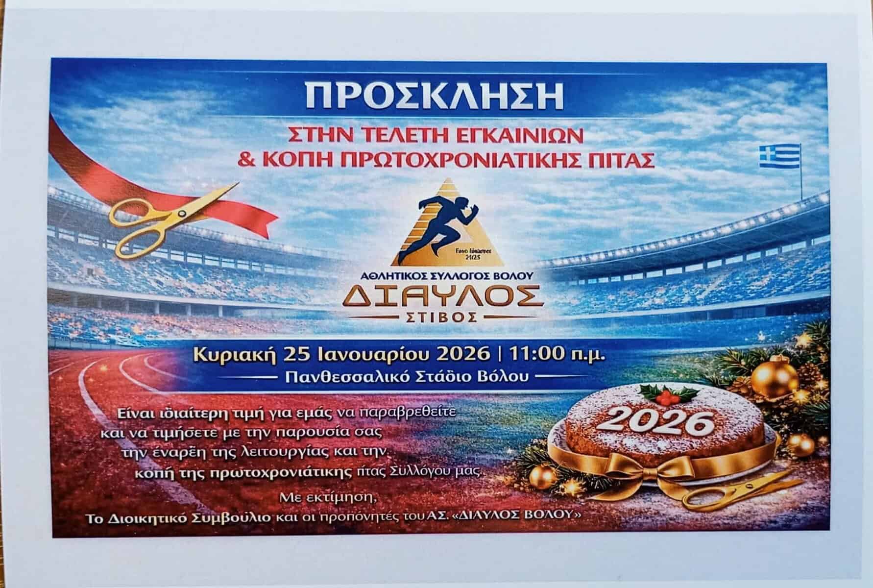 Αναλυτικά η ανακοίνωση: «Ο ΑΘΛΗΤΙΚΟΣ ΣΥΛΛΟΓΟΣ ΔΙΑΥΛΟΣ ΒΟΛΟΥ-ΣΤΙΒΟΣ» ανακοινώνει τη διοργάνωση της τελετής εγκαινίων και της κοπής της πρωτοχρονιάτικης πίτας του Συλλόγου, η οποία θα πραγματοποιηθεί την Κυριακή 25 Ιανουαρίου 2026, ώρα 11:00 π.μ. στο Πανθεσσαλικό Στάδιο Βόλου.