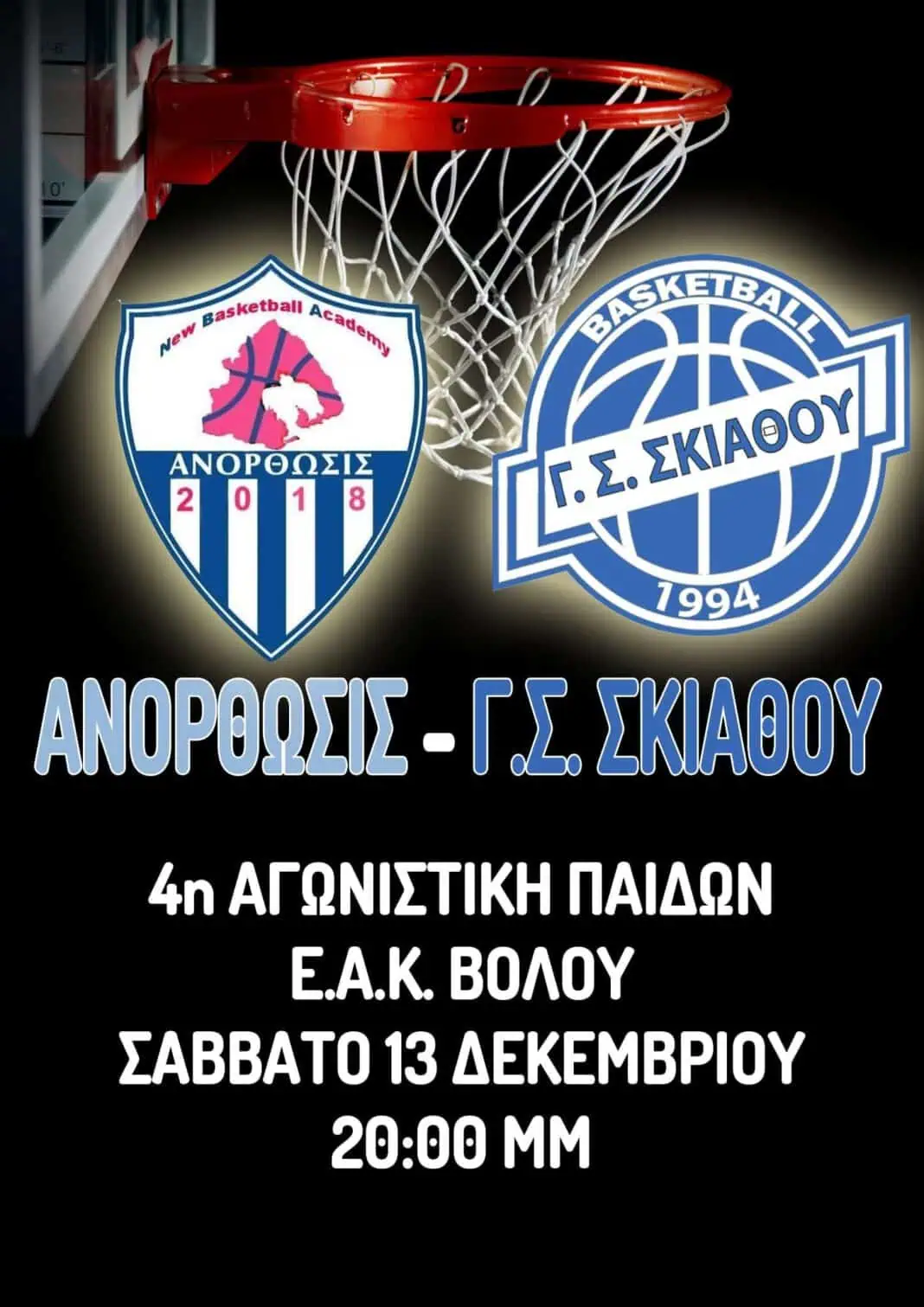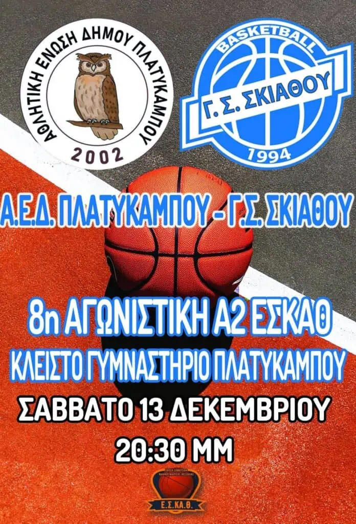 ” “Σάββατο 13 Δεκεμβρίου 2025Μπάσκετ Παιδικό U 16, Α’ Κατηγορία 4η αγωνιστική Κλειστό Γυμναστήριο Ε.Α.Κ. Βόλου 20:00Ανόρθωση Βόλου – Γ. Σ. Σκιάθου Μπάσκετ Ανδρών, Α2 ΕΣΚΑΘ, Α όμιλος 8η αγωνιστική Κλειστό Γυμναστήριο Πλατυκάμπου 20:30Α.Ε.Δ. Πλατυκάμπου – Γ. Σ. ΣκιάθουΚαλή επιτυχία σε όλους τους αθλητές μας!