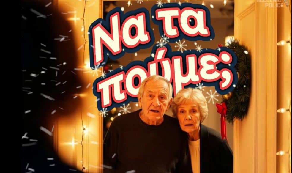 Παραμονές Χριστουγέννων, η Ελληνική Αστυνομία «μιλά» στους πολίτες με ένα γιορτινό βίντεο. Σε αυτό, ένα ζευγάρι ηλικιωμένων ακούει το κουδούνι της πόρτας να χτυπά. Στο κατώφλι εμφανίζονται τρία άτομα…