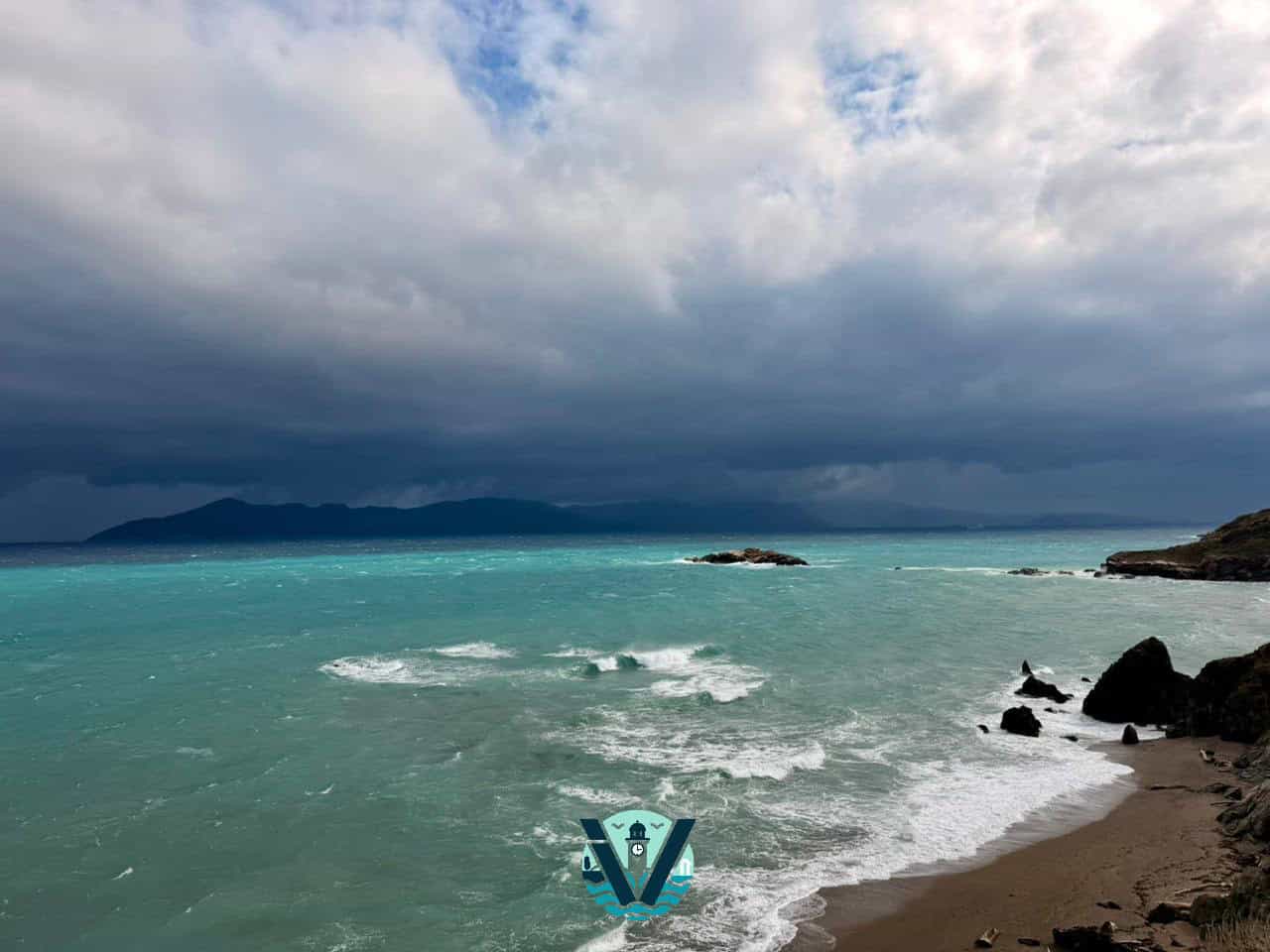 Τα τιρκουάζ νερά σμίγουν με τον βαριά συννεφιασμένο ουρανό, δημιουργώντας ένα σκηνικό γεμάτο ένταση και μεγαλείο…