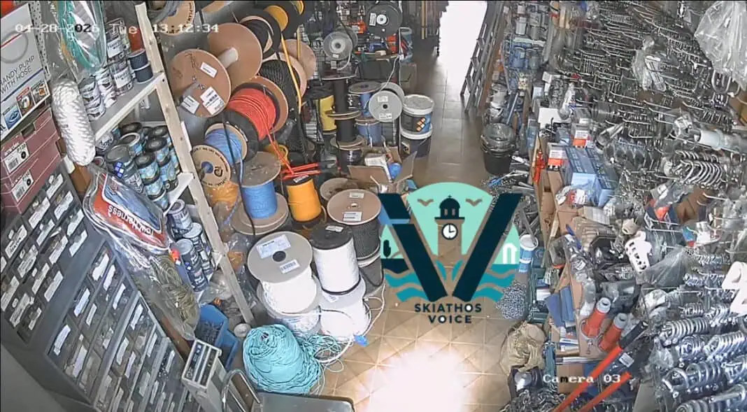 Τη στιγμή του ισχυρού σεισμού που σημειώθηκε σήμερα στη Σκιάθο καταγράφει βίντεο διάρκειας 32 δευτερολέπτων από εσωτερικό χώρο καταστήματος, αποτυπώνοντας με τον πιο χαρακτηριστικό τρόπο την ένταση της δόνησης.