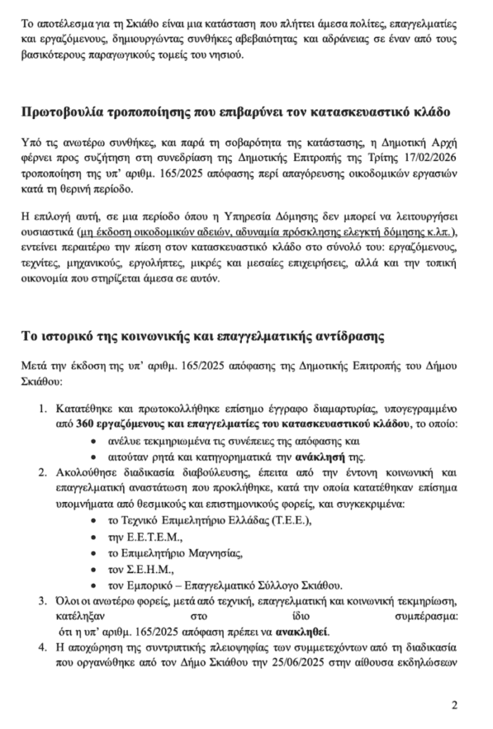 Σήμερα, Δευτέρα 16 Φεβρουαρίου 2026, κατατέθηκε με αριθμό πρωτοκόλλου 1614/16.02.2026 ανακοίνωση προς τον Δήμαρχο Σκιάθου, τα μέλη της Δημοτικής Επιτροπής και τα μέλη του Δημοτικού Συμβουλίου, σχετικά με το ζήτημα της διακοπής οικοδομικών εργασιών κατά τη θερινή περίοδο.