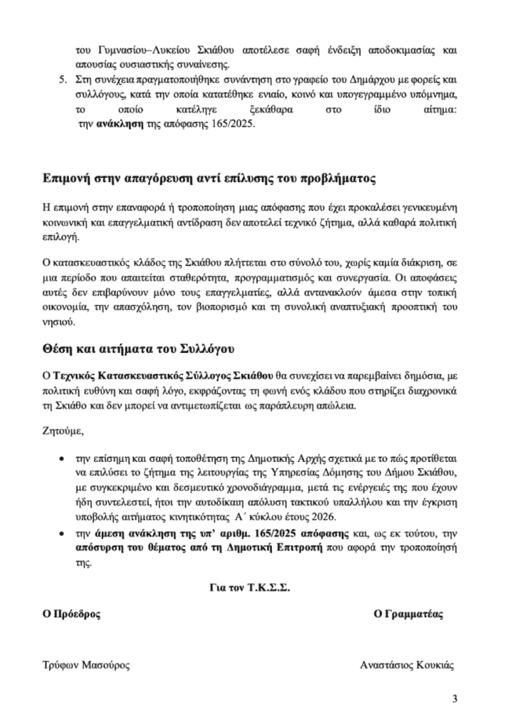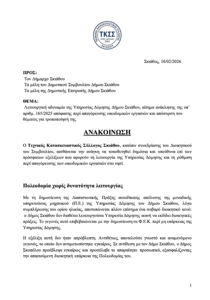 Σήμερα, Δευτέρα 16 Φεβρουαρίου 2026, κατατέθηκε με αριθμό πρωτοκόλλου 1614/16.02.2026 ανακοίνωση προς τον Δήμαρχο Σκιάθου, τα μέλη της Δημοτικής Επιτροπής και τα μέλη του Δημοτικού Συμβουλίου, σχετικά με το ζήτημα της διακοπής οικοδομικών εργασιών κατά τη θερινή περίοδο.