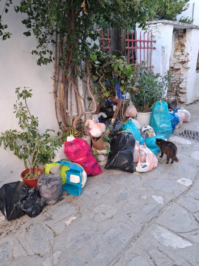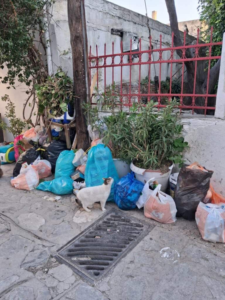 Ιδιαίτερη εντύπωση προκαλεί το γεγονός ότι σε στενό σημείο της περιοχής έχουν τοποθετηθεί απορρίμματα δίπλα σε κατοικίες και φυτεύσεις, περιορίζοντας την πρόσβαση των πεζών και δημιουργώντας εστίες δυσοσμίας και υγειονομικού κινδύνου. Παράλληλα, αδέσποτα ζώα κινούνται ανάμεσα στα σκουπίδια, αναζητώντας τροφή.