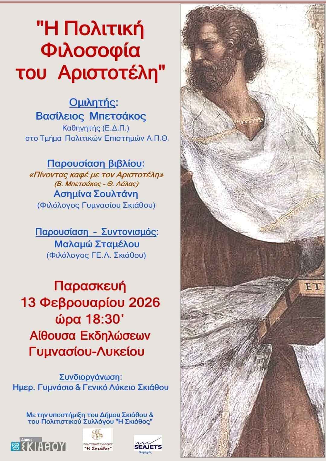 Μια ξεχωριστή πνευματική βραδιά αφιερωμένη στον Αριστοτέλη και την πολιτική του σκέψη θα πραγματοποιηθεί την Παρασκευή 13 Φεβρουαρίου 2026 και ώρα 18:30, στην Αίθουσα Εκδηλώσεων Γυμνασίου – Λυκείου Σκιάθου.