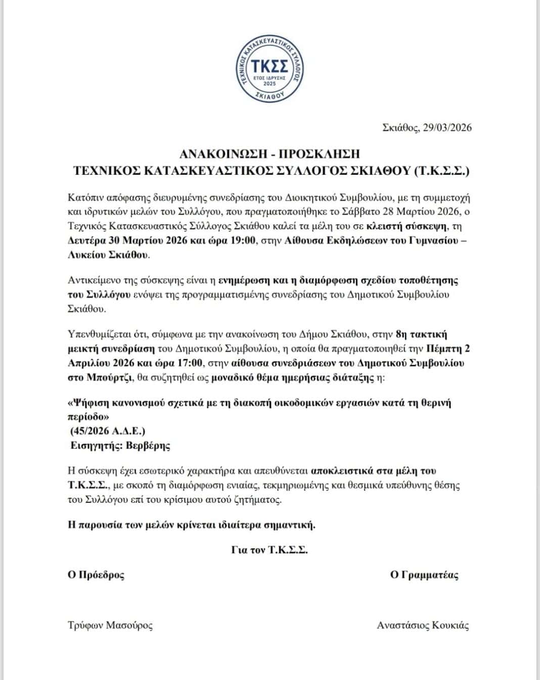 Ο Τεχνικός Κατασκευαστικός Σύλλογος Σκιάθου (Τ.Κ.Σ.Σ.), μετά από διευρυμένη συνεδρίαση του Διοικητικού Συμβουλίου με τη συμμετοχή ιδρυτικών μελών, απευθύνει πρόσκληση προς τα μέλη του σε κλειστή σύσκεψη που θα πραγματοποιηθεί τη Δευτέρα 30 Μαρτίου 2026 και ώρα 19:00, στην αίθουσα εκδηλώσεων του Γυμνασίου – Λυκείου Σκιάθου.