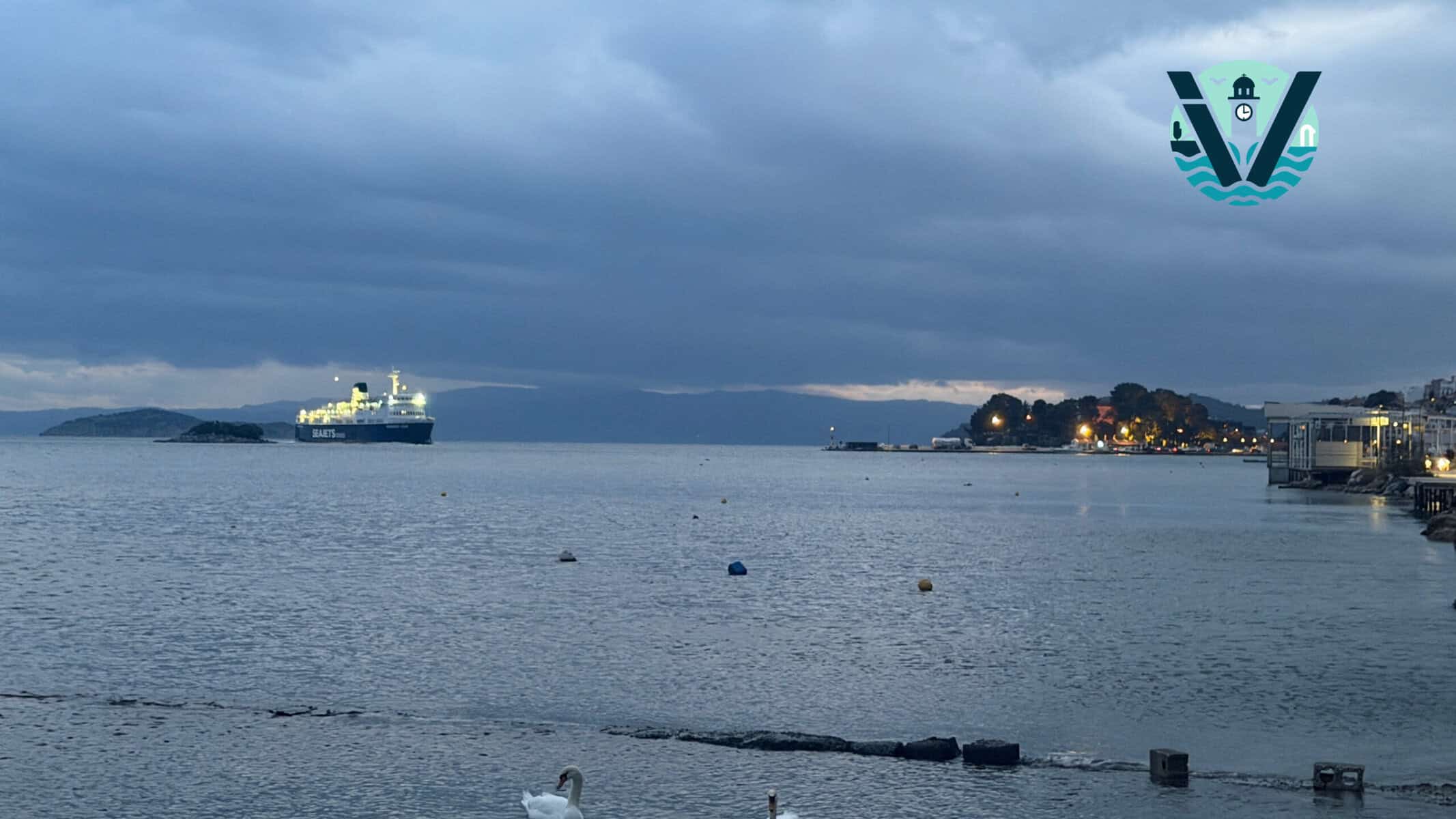 Στο βάθος το πλοίο της γραμμής, ενώ μπροστά ένας κύκνος γλιστρά αργά στη θάλασσα, δίνοντας μια νότα γαλήνης στο τοπίο.