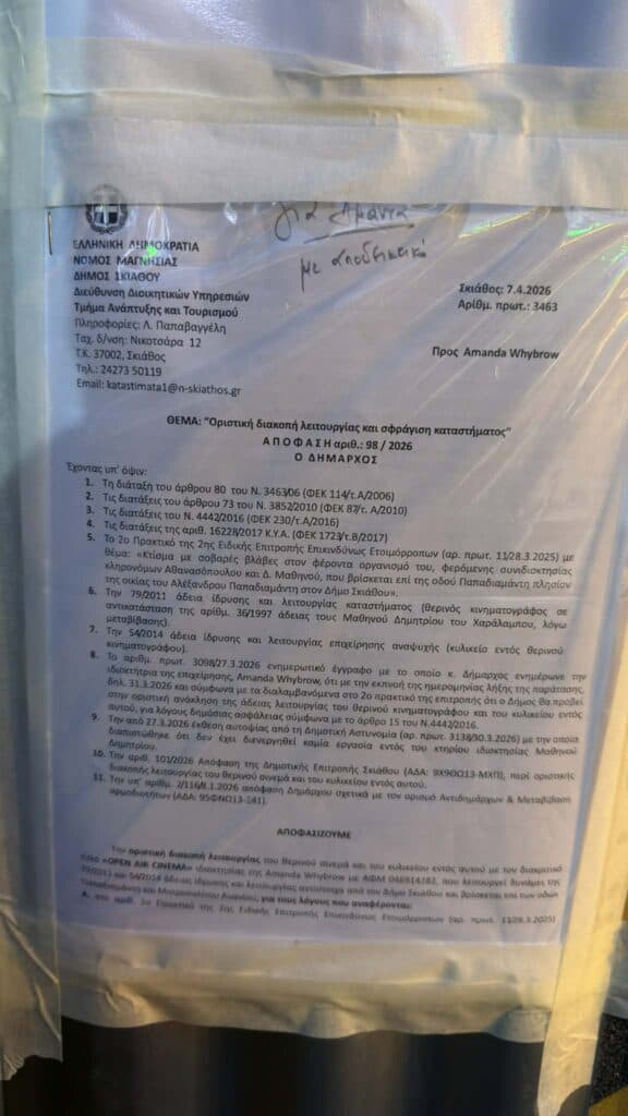 Σύμφωνα με τα έγγραφα που τοποθετήθηκαν εμφανώς στο σημείο, πρόκειται για απόφαση οριστικής διακοπής λειτουργίας και σφράγισης καταστήματος (αριθ. 98/2026), που υπογράφεται από τον Δήμαρχο Σκιάθου. Στην απόφαση κατονομάζεται ρητά η επιχείρηση ως “OPEN AIR CINEMA”, επιβεβαιώνοντας ότι αφορά τον συγκεκριμένο θερινό κινηματογράφο με κυλικείο.