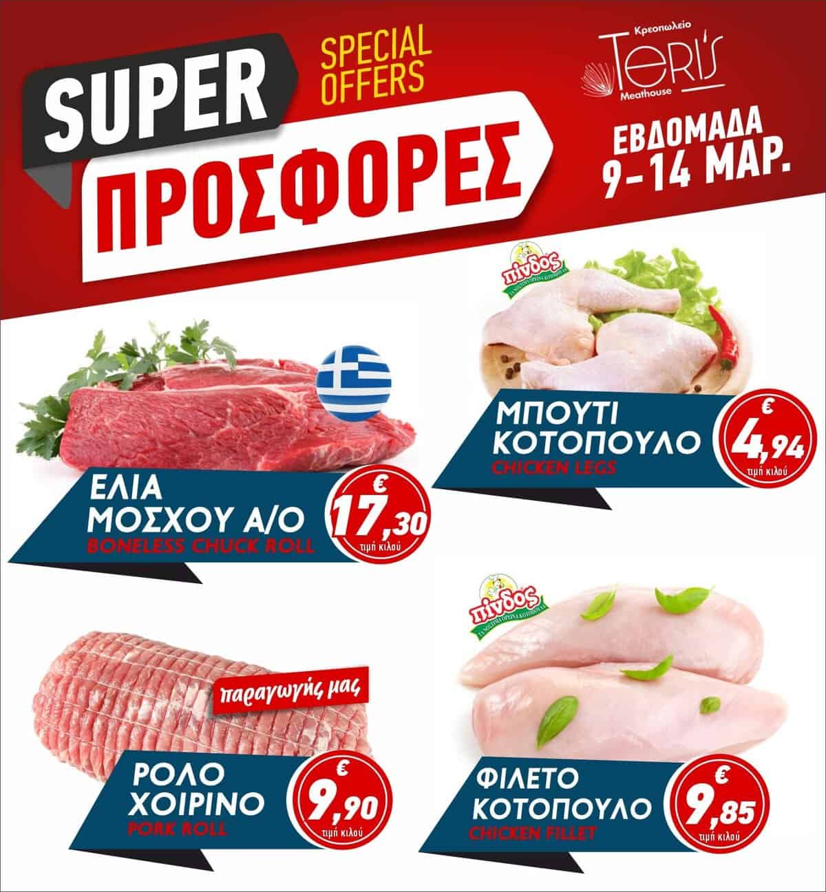 Με νέες δελεαστικές προσφορές υποδέχεται την εβδομάδα 9 έως 14 Μαρτίου το κρεοπωλείο Teri’s Meathouse, προσφέροντας ποιοτικά κρέατα σε ιδιαίτερα προσιτές τιμές για τους κατοίκους και τους επισκέπτες του νησιού.