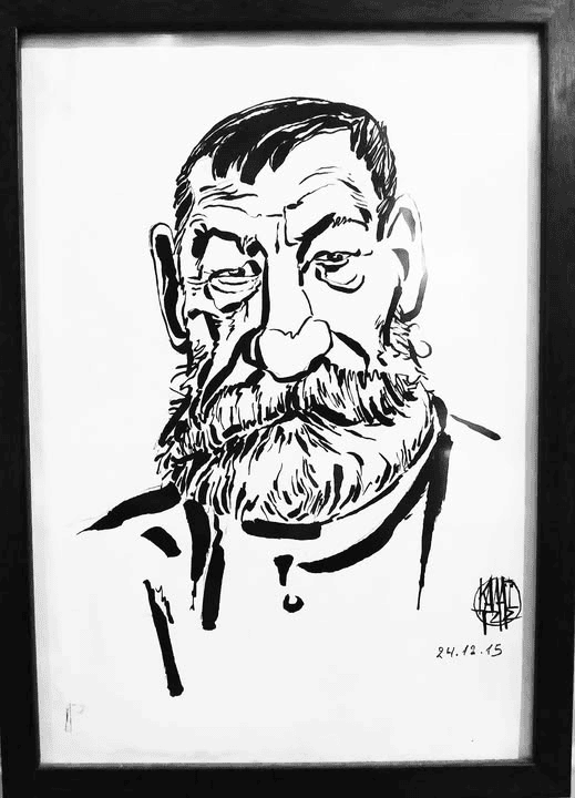 Στη κεντρική κολώνα του καφενείου λοιπόν, συναντούμε μεταξύ των άλλων, κι ένα σκίτσο του Παπαδιαμάντη. Είναι δημιούργημα του γνωστού σκιτσογράφου Γιάννη Καλαϊτζή (1945- 2016) που είχε επιδοθεί κυρίως στην πολιτική σάτιρα. Προέκυψε μετά από επίμονο αίτημα του δημοσιογράφου και χρονογράφου Πέτρου Μανταίου, όπως το αποκάλυψε ο ίδιος στο άρθρο του στην Εφημερίδα των Συντακτών με τον τίτλο ‘’Ενα πορτρέτο του Παπαδιαμάντη’’*. Ώσπου ο σκιτσογράφος ανταποκρίθηκε: