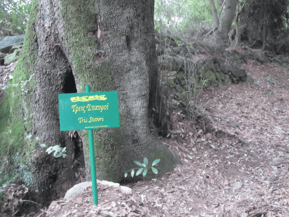 Κατηφορίζοντας απ’ τον Άγιο Απόστολο στο βαθύσκιωτο παλιό μονοπάτι που οδηγεί στο Κάστρο, θα συναντήσετε στα δεξιά σας τον πελώριο κορμό ενός δέντρου πάνω στον οποίο σώζονται ακόμα οι χαρακές απ’ τα προεπαναστατικά χρόνια που σχηματίζουν τρεις Σταυρούς.