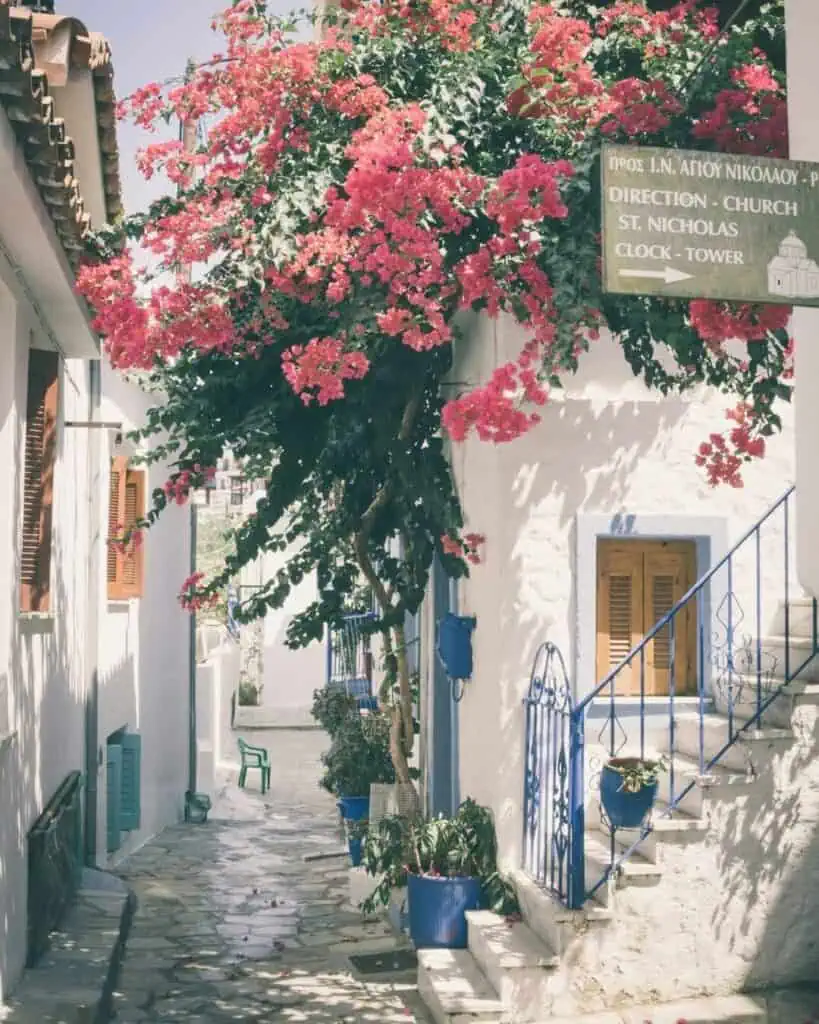 Μωβ, φραμπουάζ, ροζ, ακόμα και άσπρες. Πολύχρωμη η σημερινή Σκιάθος με τις βουκαμβίλιες να στολίζουν τα σπίτια και τα σοκάκια της. Πώς και πότε όμως έφτασαν στο νησί;