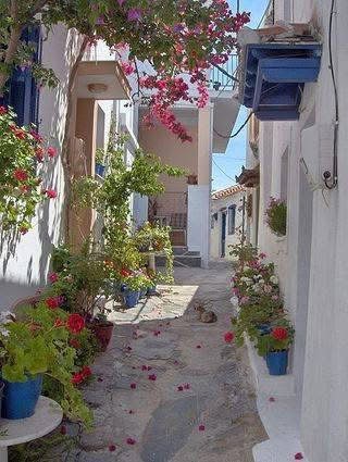 Στην κατάφυτη από ενδημικά φυτά Σκιάθο, άργησαν να έρθουν. Ο καλλωπισμός των σπιτιών και των αυλών άρχισε μόλις στον Μεσοπόλεμο με την άφιξη των Μικρασιατών προσφύγων που τον είχαν στην κουλτούρα τους και τον συνέχισαν στο νησί.