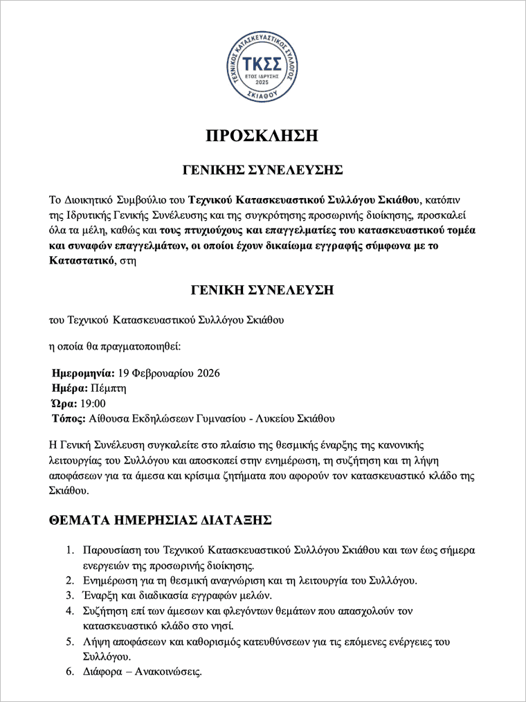 του Τεχνικού Κατασκευαστικού Συλλόγου Σκιάθου