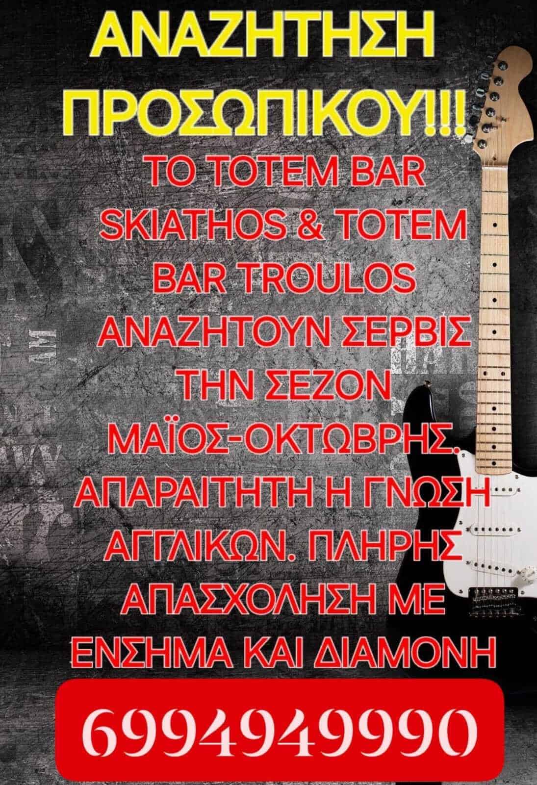 Σε αναζήτηση προσωπικού ενόψει της θερινής σεζόν βρίσκονται τα Totem Bar Skiathos και Totem Bar Troulos, δύο γνωστά καταστήματα διασκέδασης του νησιού.