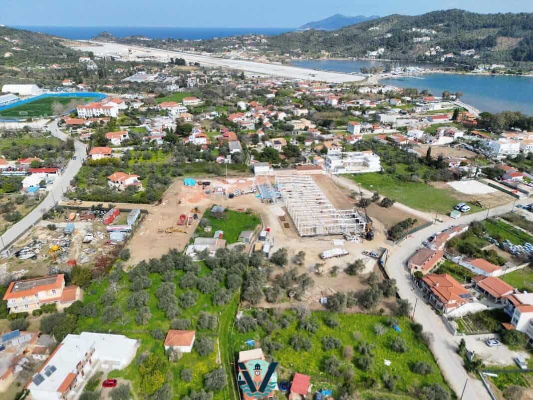 \Στο εργοτάξιο, που βρίσκεται σε κομβικό σημείο κοντά στο αεροδρόμιο του νησιού, διακρίνεται ήδη ο βασικός μεταλλικός σκελετός του κτιρίου, γεγονός που δείχνει ότι το έργο έχει περάσει σε προχωρημένο στάδιο.