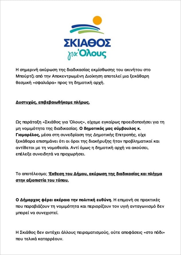 Έντονες πολιτικές αντιδράσεις προκαλεί στη Σκιάθο η ακύρωση της διαδικασίας εκμίσθωσης ακινήτου στο Μπούρτζι από την Αποκεντρωμένη Διοίκηση, με την παράταξη «Σκιάθος για Όλους» να κάνει λόγο για θεσμική «σφαλιάρα» προς τη δημοτική αρχή.