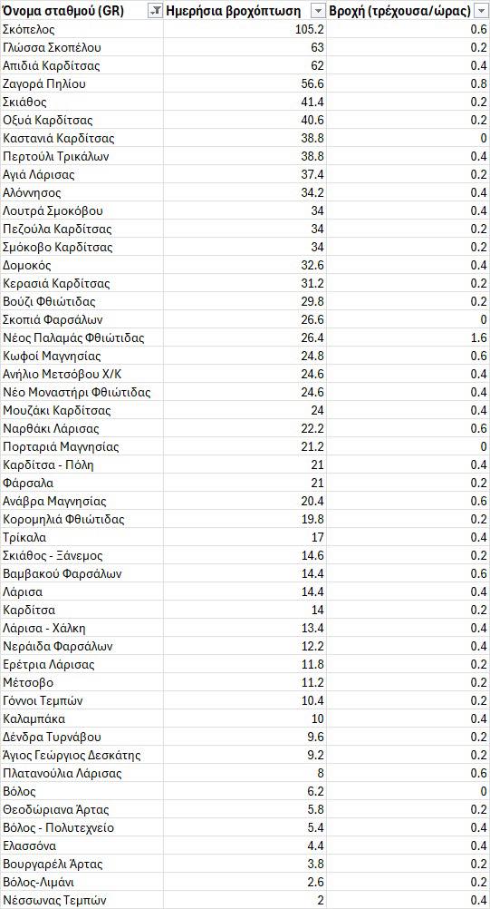 Σύμφωνα με τα διαθέσιμα στοιχεία, η Σκόπελος κατέγραψε το υψηλότερο ημερήσιο ύψος βροχής, φτάνοντας τα 105,2 χιλιοστά, τιμή που κατατάσσει το νησί στην κορυφή των μετρήσεων πανελλαδικά για το συγκεκριμένο φαινόμενο.
