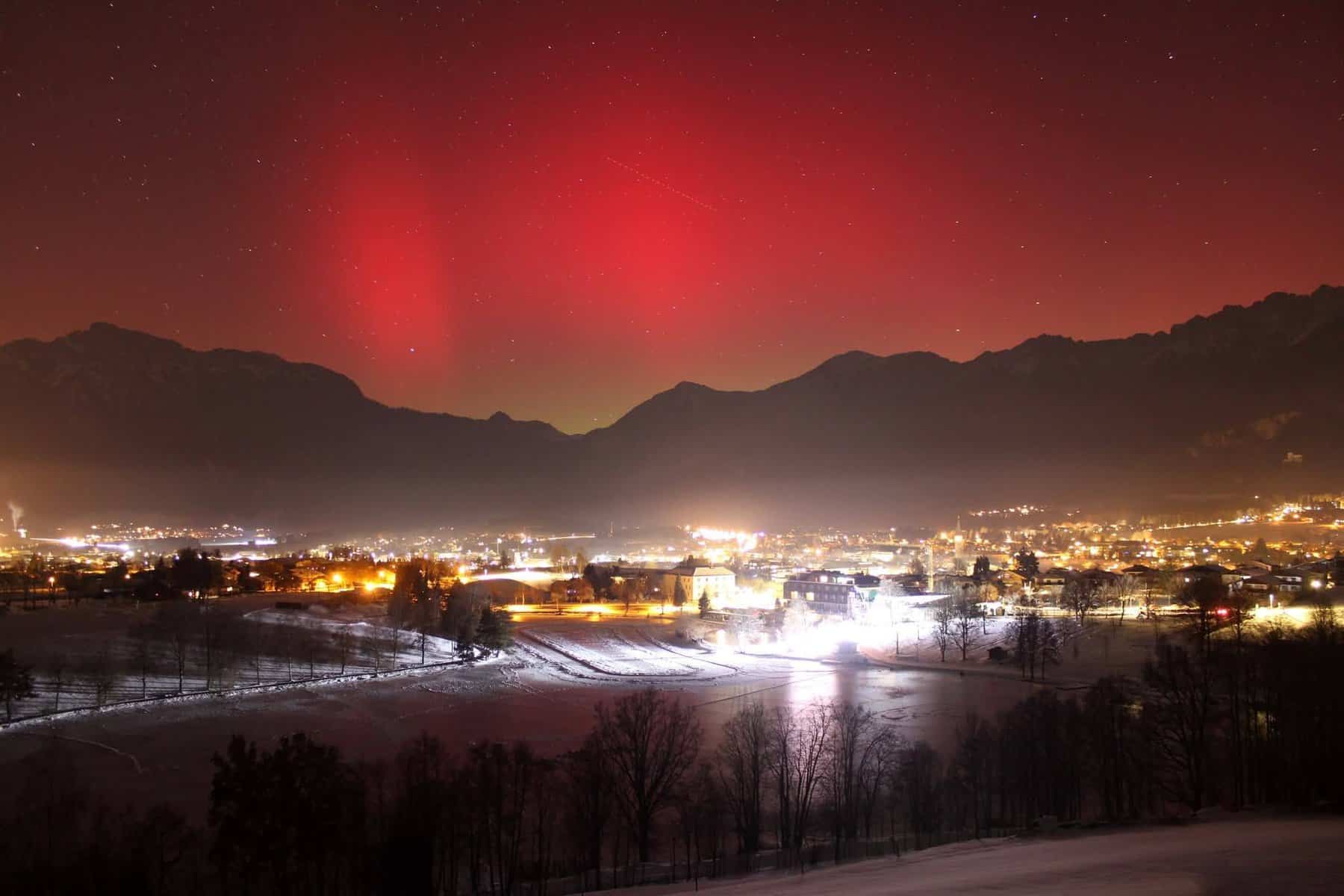 Ένα σπάνιο και άκρως εντυπωσιακό φυσικό φαινόμενο κατέγραψε ο φωτογραφικός φακός χθες το βράδυ πάνω από το Saalfelden της Αυστρίας. Ο νυχτερινός ουρανός «ντύθηκε» με έντονα κόκκινα και πράσινα χρώματα, καθώς το Βόρειο Σέλας έγινε ορατό, δημιουργώντας ένα μοναδικό θέαμα πάνω από τα βουνά και την πόλη.