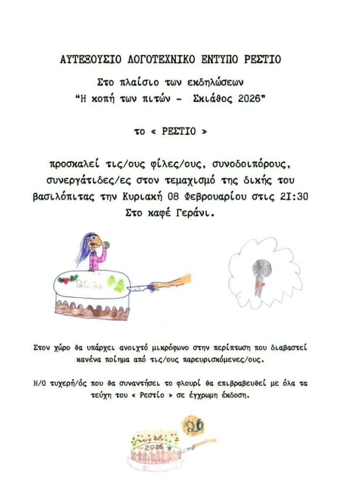 Με λόγο, φαντασία και διάθεση γιορτής, το Αυτοδιαχειριζόμενο Λογοτεχνικό Έντυπο «Ρεστίο» καλεί φίλους, συνοδοιπόρους και συνεργάτες στην κοπή της πρωτοχρονιάτικης πίτας του, στο πλαίσιο των εκδηλώσεων «Η κοπή των πιτών – Σκιάθος 2026».