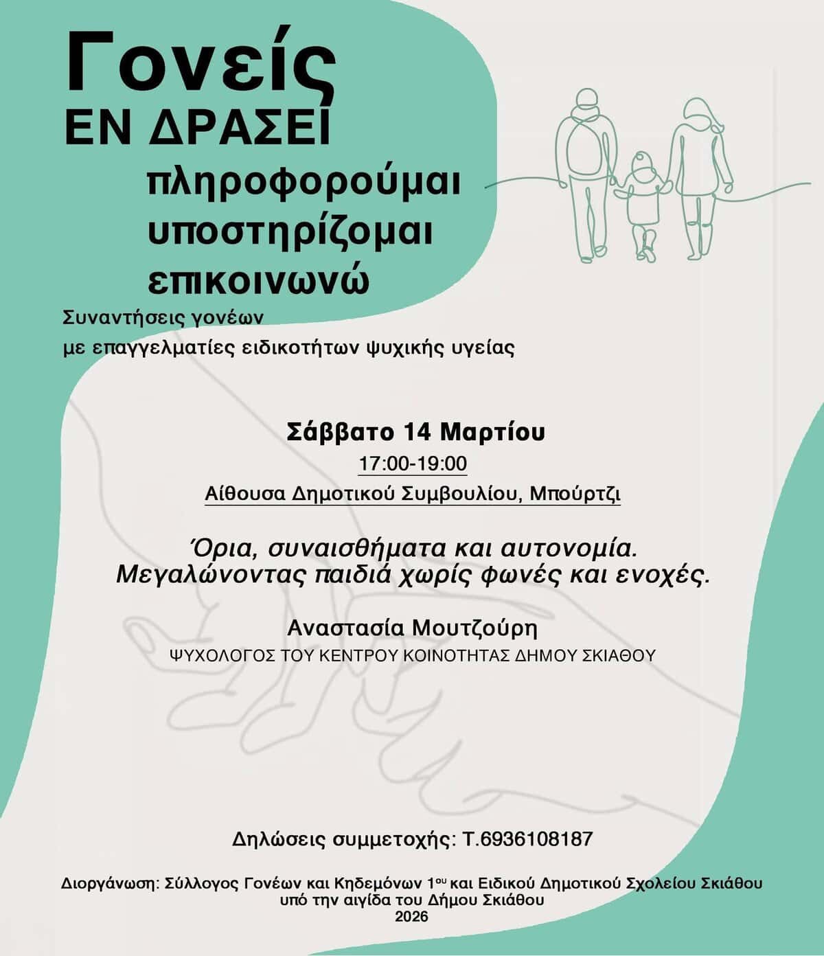 Εισηγήτρια αυτής της συνάντησης μας είναι η ψυχολόγος του Κέντρου Κοινότητας Δήμου Σκιάθου Αναστασία Μουτζούρη και το θέμα που θα αναπτυχθεί είναι: Όρια, συναισθήματα και αυτονομία.
