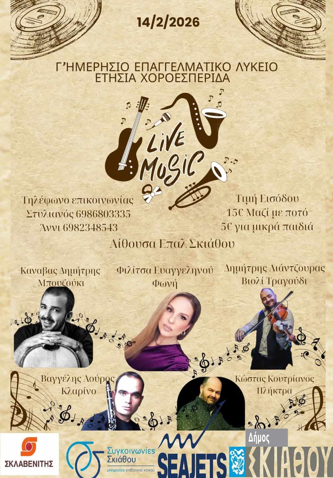 Το Γ’ Ημερήσιο Επαγγελματικό Λύκειο Σκιάθου διοργανώνει την ετήσια χοροεσπερίδα του το Σάββατο 14 Φεβρουαρίου 2026, στην Αίθουσα ΕΠΑΛ Σκιάθου, με υπόσχεση για μια βραδιά γεμάτη μουσική, χορό και διασκέδαση.