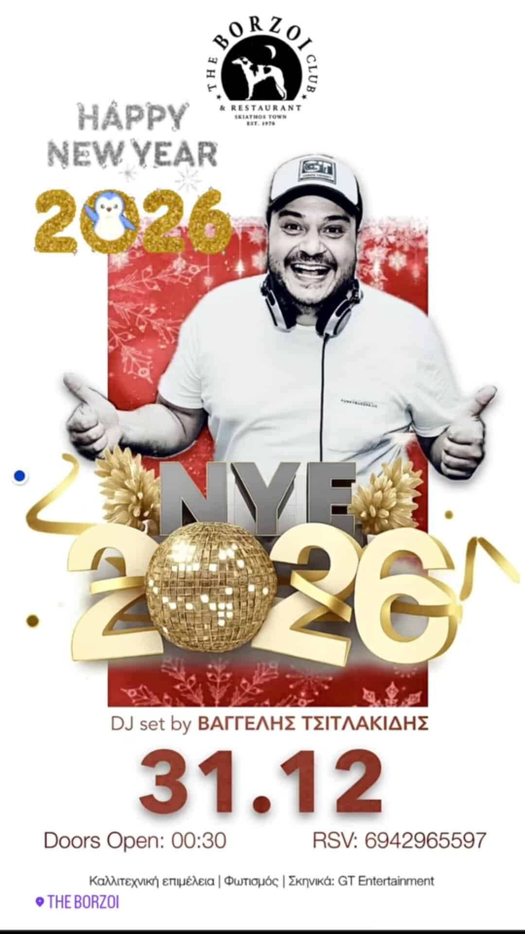 Τη μουσική επιμέλεια της βραδιάς αναλαμβάνει ο DJ Βαγγέλης Τσιτλακίδης, ο οποίος με ένα εκρηκτικό DJ set υπόσχεται να κρατήσει αμείωτο το κέφι μέχρι τις πρώτες πρωινές ώρες του 2026.