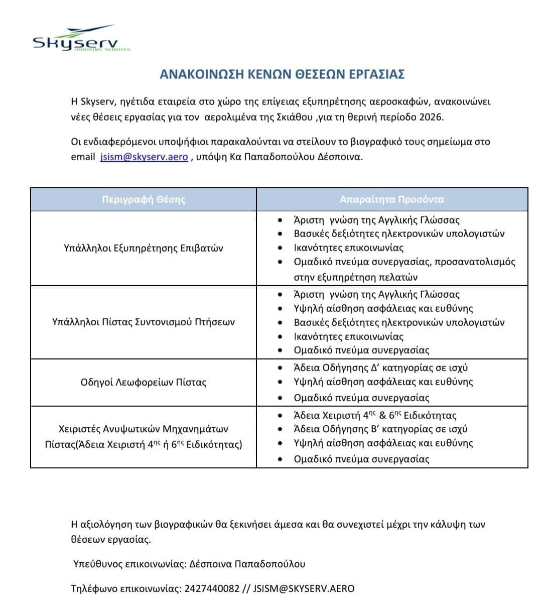 Η Skyserv Handling Services, μία από τις κορυφαίες ελληνικές εταιρείες στον τομέα της επίγειας εξυπηρέτησης αεροσκαφών, ανακοινώνει το άνοιγμα νέων θέσεων εργασίας για τον Αερολιμένα Σκιάθου, ενόψει της θερινής περιόδου 2026.