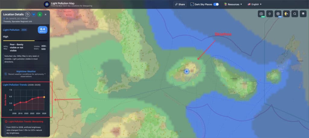 Η Σκιάθος — με το φυσικό της τοπίο, τα δάση, και τη μικρή σχετικά αστική ανάπτυξη — παρέμενε μια από τις πιο «σκοτεινές» περιοχές του Αιγαίου, καθιστώντας την ιδανική για παρατήρηση του ουρανού. Η νύχτα εδώ είναι λιγότερο επηρεασμένη από έντονες αστικές φωτεινότητες, ειδικά αν κανείς μετακινηθεί λίγο έξω από τον οικισμό προς τα ψηλότερα σημεία ή τις εξοχές.