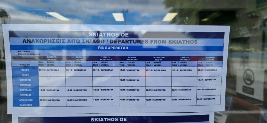 Από Σκιάθο, αναχωρήσεις προς Μαντούδι στις 10:15 και προς Βόλο στις 18:45.