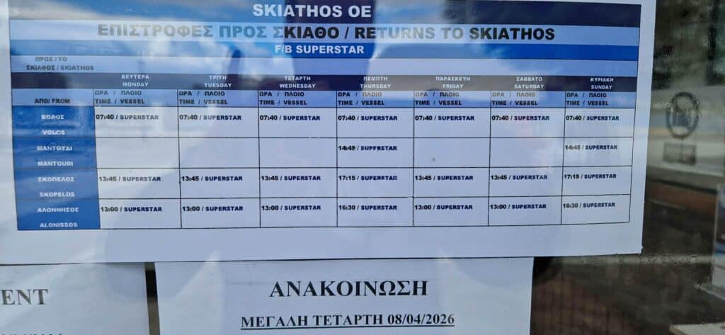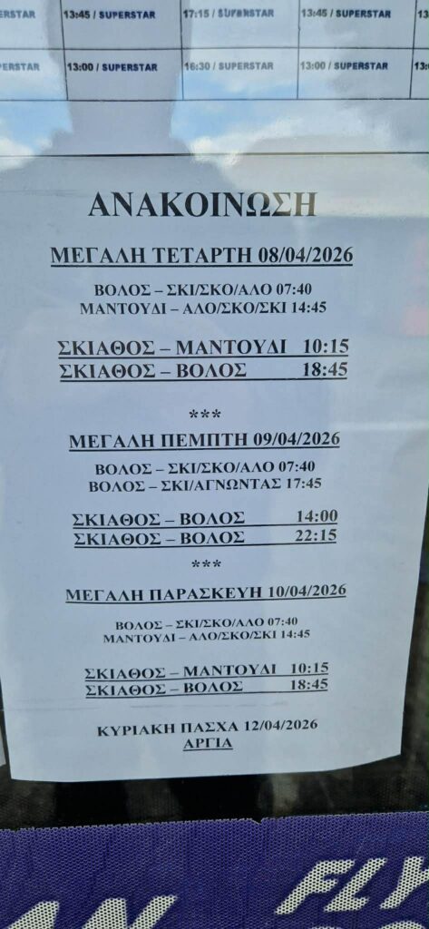 Από Σκιάθο, αναχωρήσεις προς Μαντούδι στις 10:15 και προς Βόλο στις 18:45. - Μεγάλη Πέμπτη (09/04/2026):