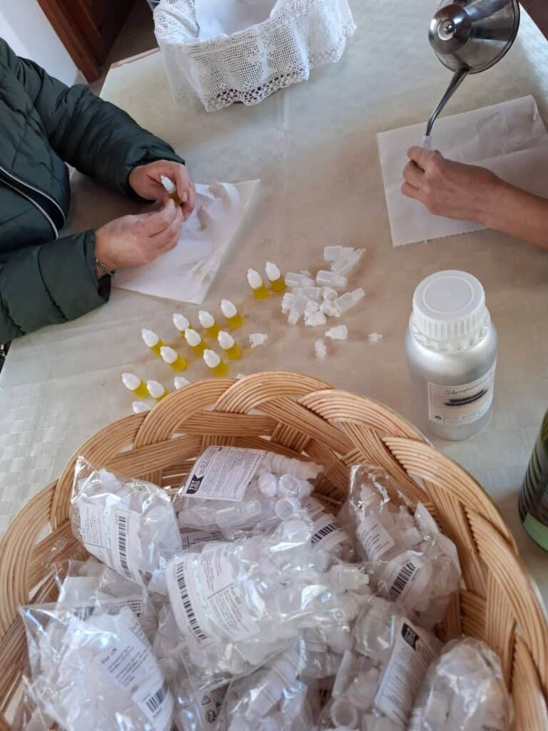 Σειρά αυτή τη φορά έχουν τα φιαλίδια με το αρωματισμένο ελαιόλαδο, τα οποία προετοιμάζονται με φροντίδα και αγάπη, ώστε να χρησιμοποιηθούν στο Μυστήριο του Αγίου Ελαίου.