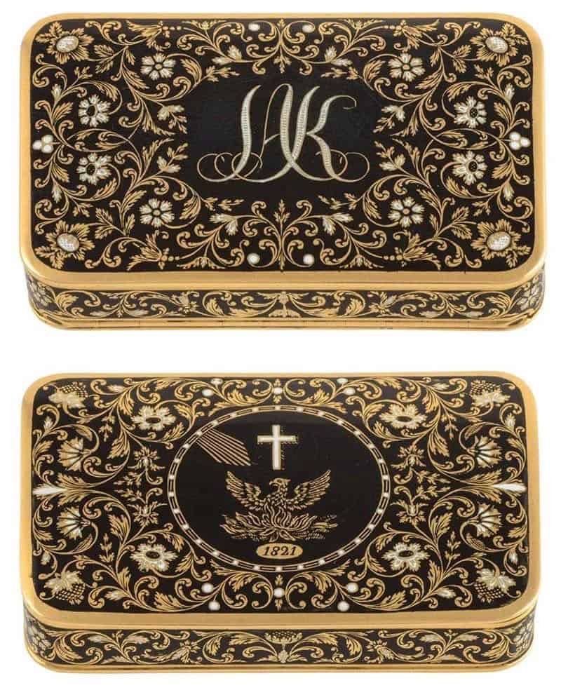 Στη φωτογραφία η χρυσή ταμπακιέρα του Καποδίστρια. Πωλήθηκε το 2018 σε δημοπρασία για 73.392 ευρώ. Την είχε κατασκευάσει το 1826 στη Γενεύη ο διάσημος κοσμηματοποιός Jean François Bautte. Εχει στη βάση της τα αρχικά του κυβερνήτη, έναν φοίνικα στο καπάκι και τη χρονολογία 1821.