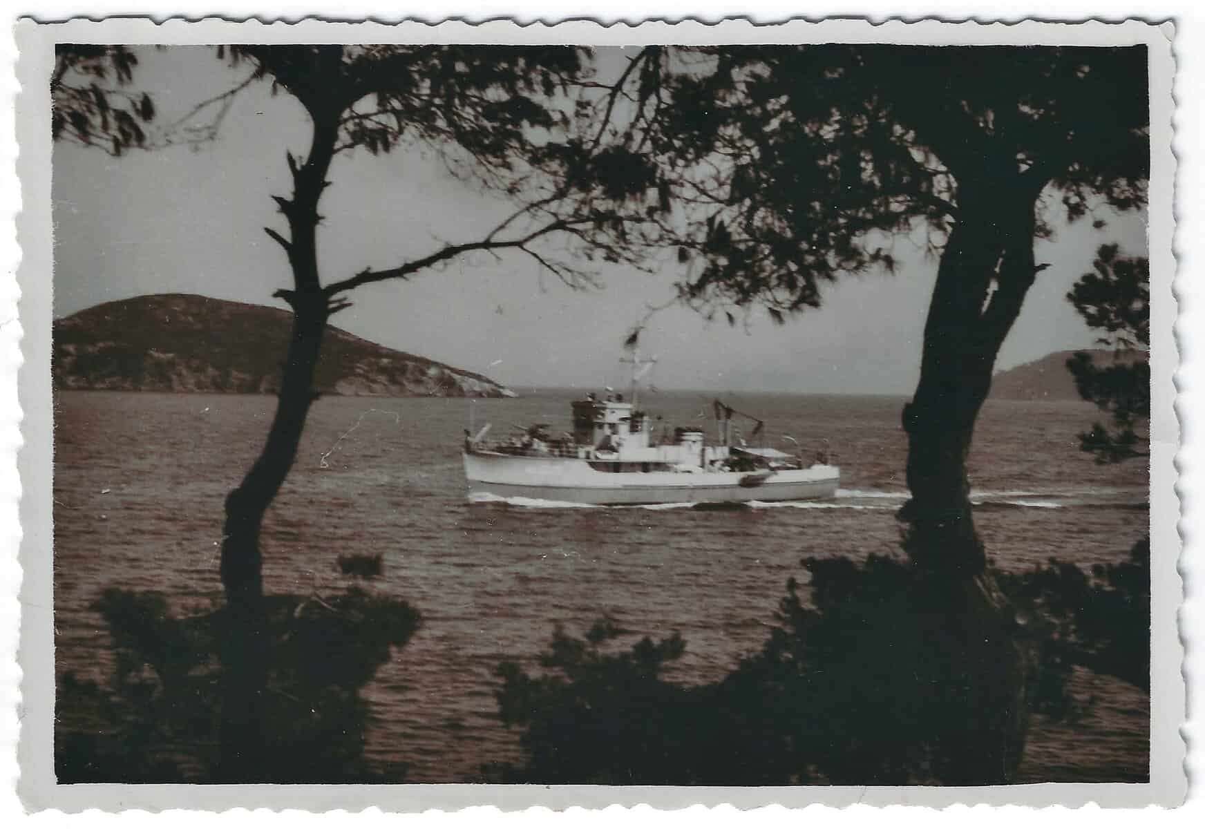 Σπάνια φωτογραφία από το αρχείο του Μενέλαου Χριστόπουλου με ναρκαλιευτικό (πιθανόν το ΑΦΡΟΕΣΑ) να προσεγγίζει το λιμάνι της Σκιάθου μετά τον Β’ΠΠ.