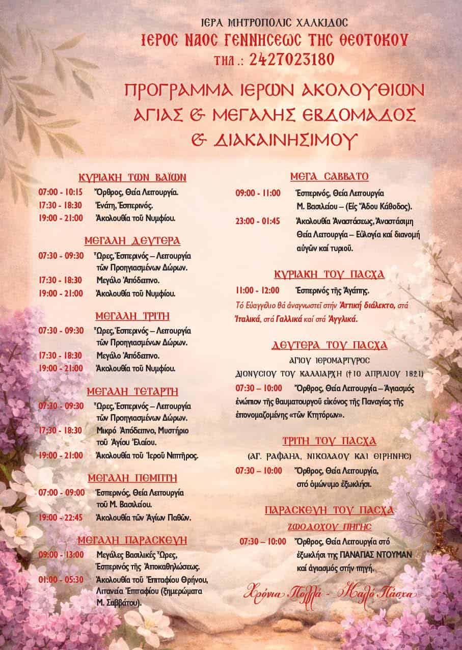 Με πνεύμα κατάνυξης και βαθιάς θρησκευτικής ευλάβειας, ο Ιερός Ναός Γεννήσεως της Θεοτόκου Σκιάθου ανακοίνωσε το αναλυτικό πρόγραμμα των Ιερών Ακολουθιών για τη Μεγάλη Εβδομάδα και τη Διακαινήσιμο.