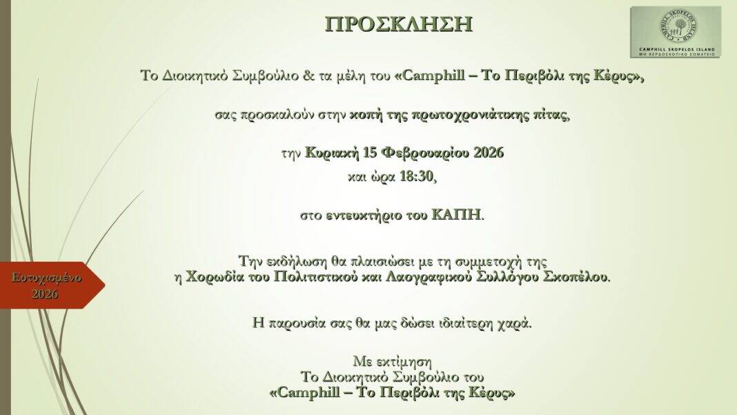 Το Διοικητικό Συμβούλιο και τα μέλη του Camphill – «Το Περιβόλι της Κέρυς» προσκαλούν το κοινό στην κοπή της πρωτοχρονιάτικης πίτας του φορέα, η οποία θα πραγματοποιηθεί την Κυριακή 15 Φεβρουαρίου 2026, στις 18:30, στο εντευκτήριο του ΚΑΠΗ.
