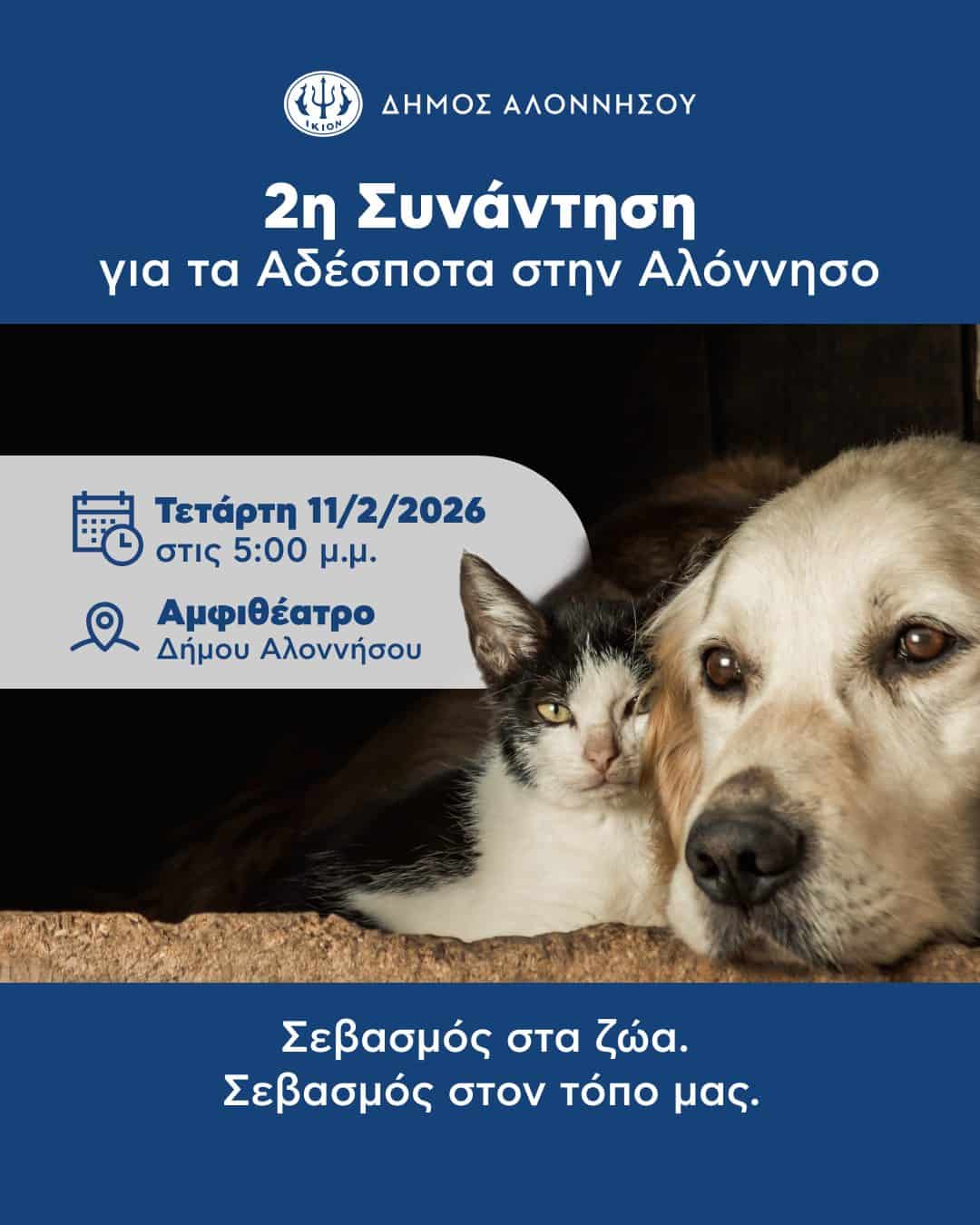 Την Τετάρτη 11 Φεβρουαρίου, στις 17:00, στο Αμφιθέατρο του Δήμου Αλοννήσου, πραγματοποιείται η δεύτερη συνάντηση για το ζήτημα των αδέσποτων ζώων στο νησί μας.