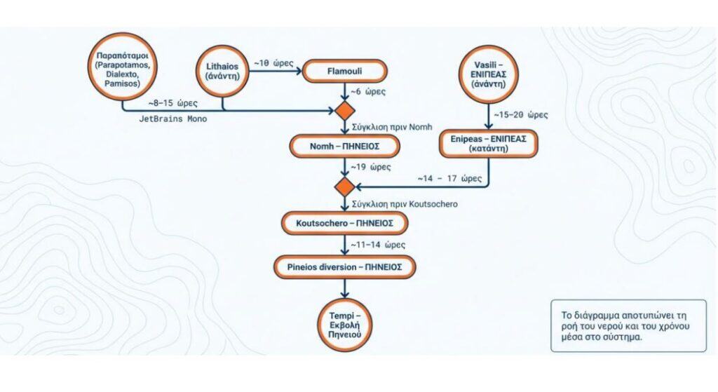 *Επισυνάπτονται πίνακες που αποτυπώνουν σε πόση ώρα καταλήγει το νερό από περιοχή σε περιοχή