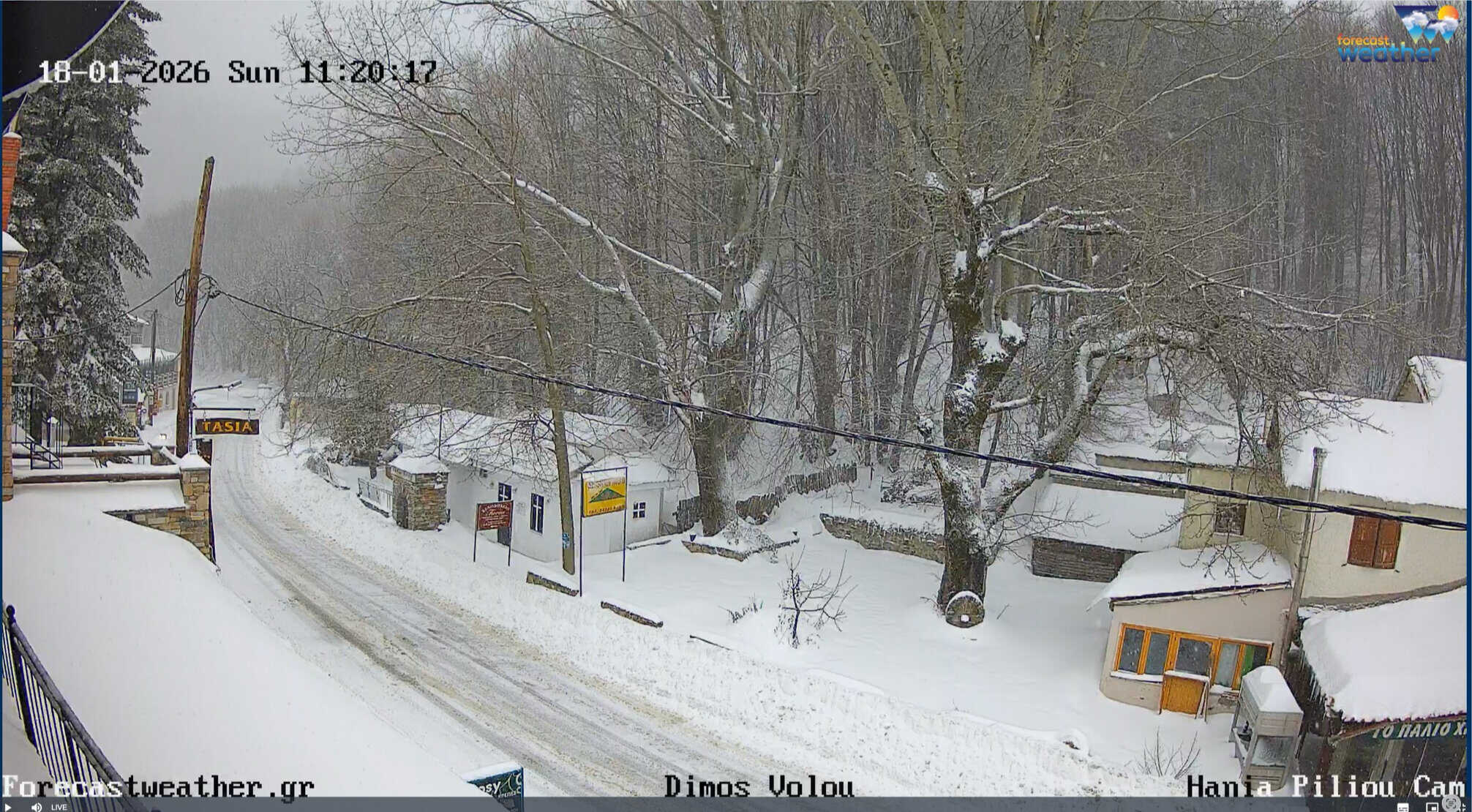 Η ζωντανή εικόνα από την περιοχή επιβεβαιώνει την ένταση της χιονόπτωσης, με την ορατότητα να είναι περιορισμένη κατά διαστήματα και τις συνθήκες να θυμίζουν πλήρως χειμωνιάτικο σκηνικό στο Πήλιο.